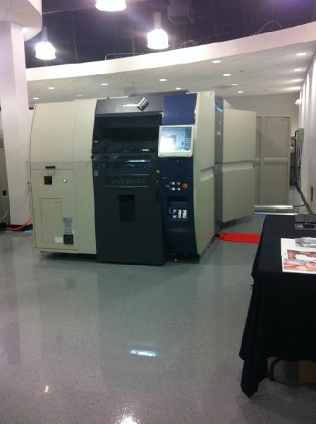The press runs at 1,400 x 1,400 dpi, producing 1,620 sheets in simplex and 820 in duplex mode—not the fastest machine on the market, though it draw some kudos from observers for its quality. It runs specialized aqueous inks on any stock, without pre-coating, though an aqueous overcoat is laid over the image upon printing.