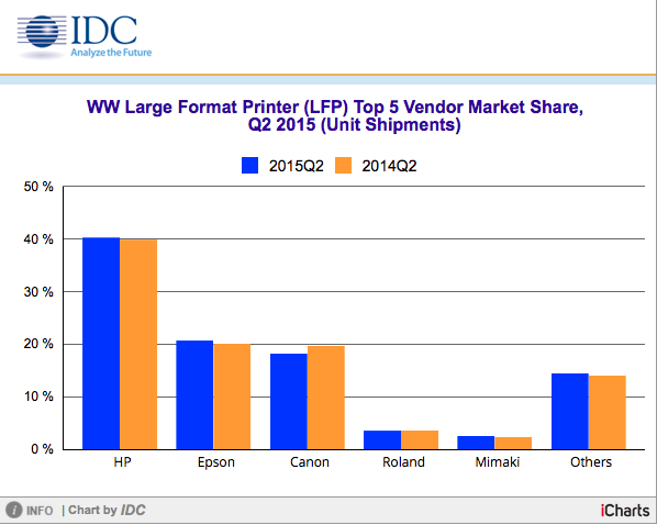 FRAMINGHAM, MASS—According to the International Data Corporation’s (IDC), Worldwide Quarterly Large Format Print Tracker, the shipment of large format printers has gone up by 1.3% from the second quarter of 2014 to the second quarter of 2015. Revenue has remained flat.