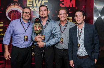 The winning team (left to right): John Druce, Unique Media Solutions, Cameron Blancher, installer at Mediaman Graphic Installation, Roy Druce, Unique Medial Solutions and Sam Stout, recently-retired UFC contender who presented Cameron with his championship belt.