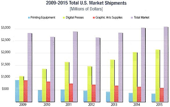 Shipments for traditional printing equipment fell 6 percent in 2015 to $346 million [$368 million in 2014]. Printing equipment and graphic arts supplies shipments are nowhere near their 2008/2009 levels, or years prior, and continue their steady declines. In 2015, shipments of graphic arts supplies declined seven percent to $580 million [$623 million in 2014].